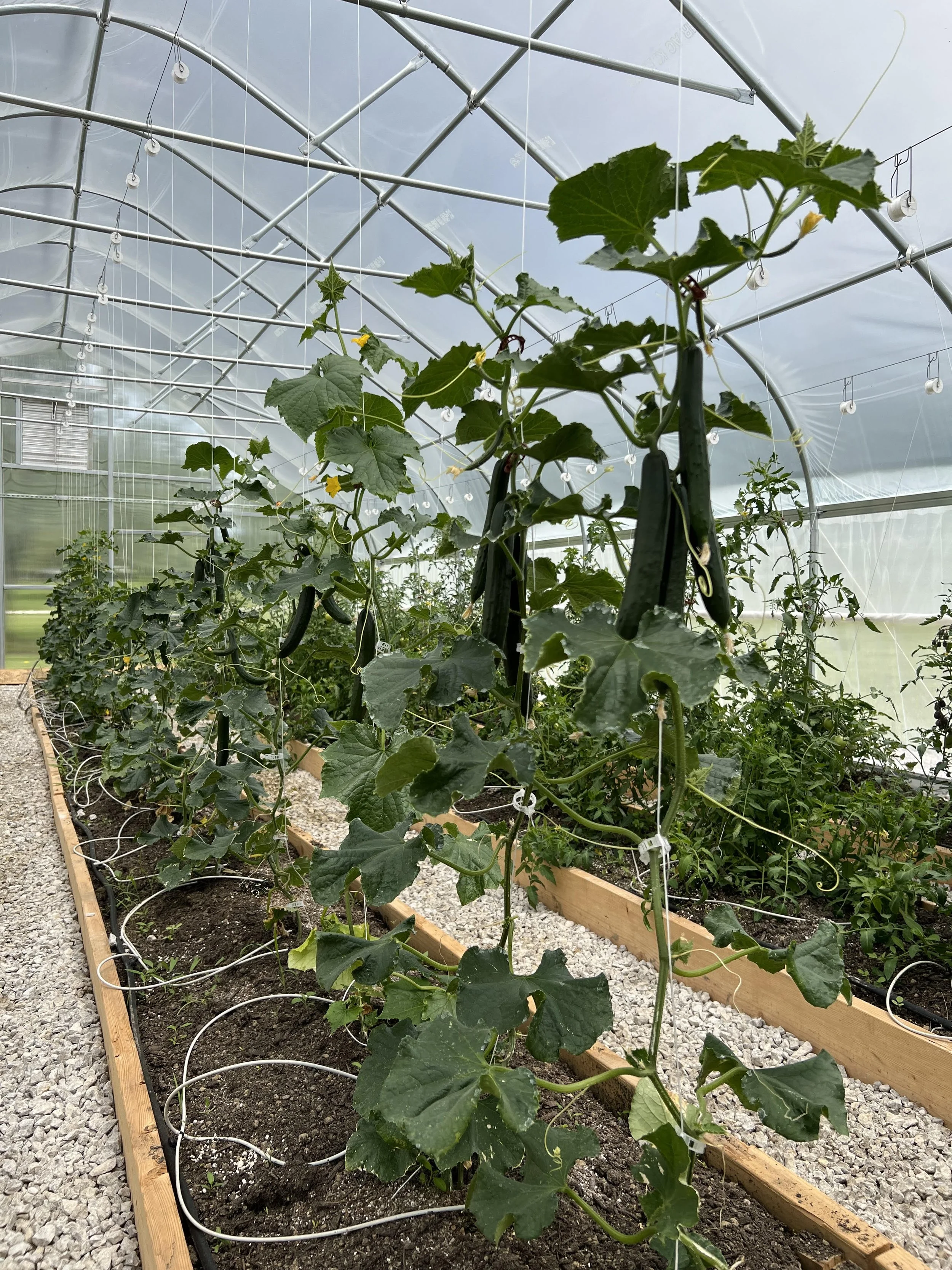 We have cucumbers! This is the earliest we’ve had cucumbers and we’re so excited to be able to start bringing them to the Medina Square Farmers Market this early in the season. Our success at achieving such an early start to our cucumbers is attributed to starting them in one of our first two heated greenhouses and then transplanting them to their new homes (an unheated greenhouses) once the threat of sub freezing temperatures had past. Even after we made the call to transplant them, we had to utilize a space heater on a handful of nights that crept too close for comfort to freezing temperatures. It seems like late spring frosts are becoming even more unpredictable than they ever have been before. Anyways, as all good farmers do, we had a plan, a backup plan, and we were able to adapt and overcome!